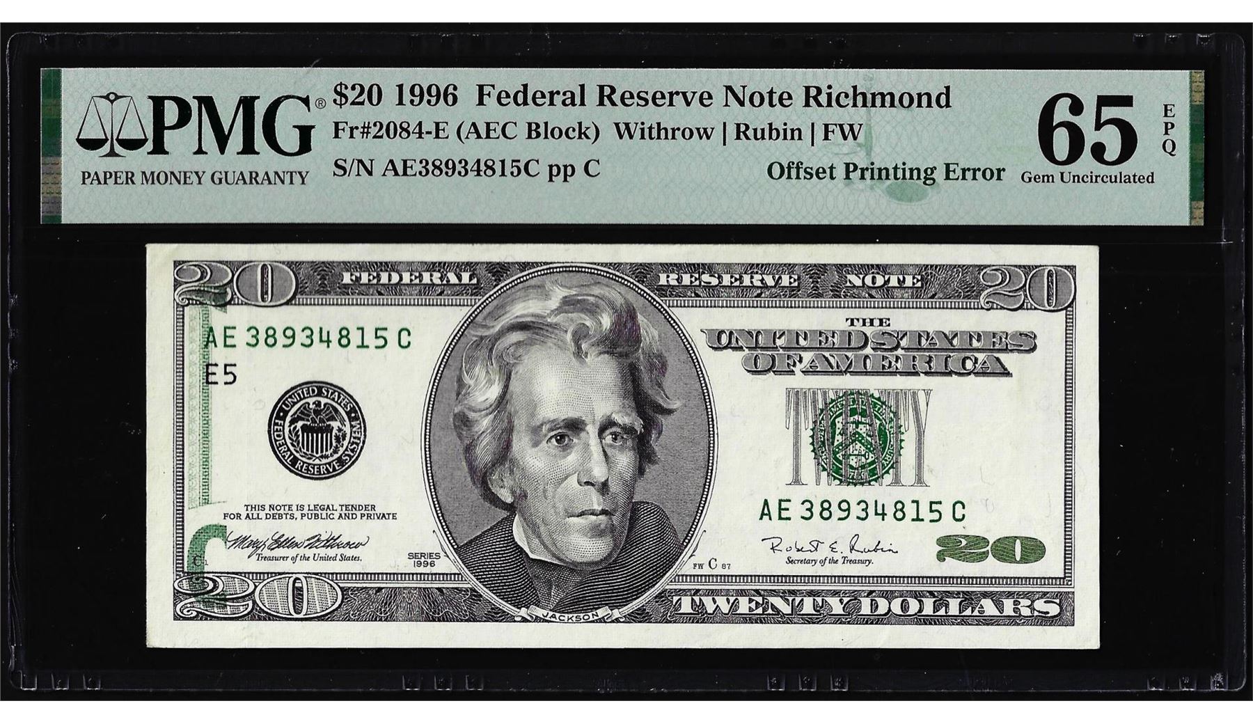 One 1996 $20 Federal Reserve Offset Printing Error Note PMG Gem Uncirculated 65EPQ. PMG Certified.