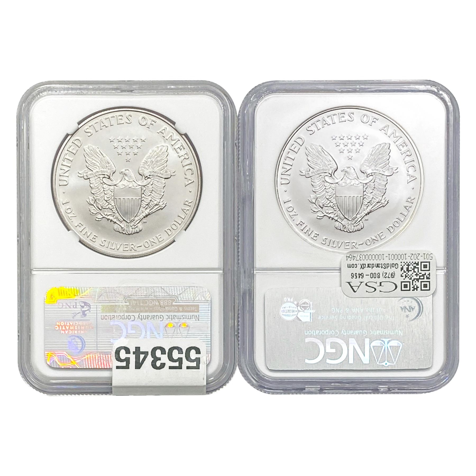 e. Coins sold referencing a third-party grading service are sold “AS IS” without any express or implied warranty, except for a guarantee by GSA that they are genuine. Removal or alteration of the holder, voids all of Bidder’s claims concerning that Product. Certain warranties may be available from the grading services and Bidders are referred to them for further details: Numismatic Guaranty Corporation (NGC), PO Box 4776, Sarasota, FL 34230, www.ngccoin.com/services/writtenguarantee.asp; Professional Coin Grading Services (PCGS), PO Box 9458, Newport Beach, CA 92658, www.pcgs.com/guarantee.html; ANACS, 6555 S. Kenton St., Ste. 303, Englewood, CO 80111; and Independent Coin Grading Co. (ICG), 7901 East Bellview, Ave., Suite 50, Englewood, CO 80111.