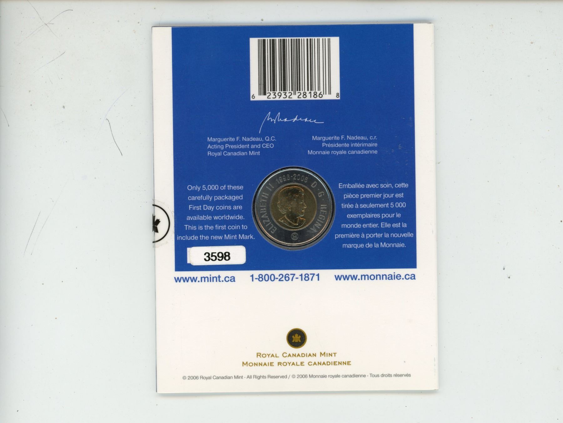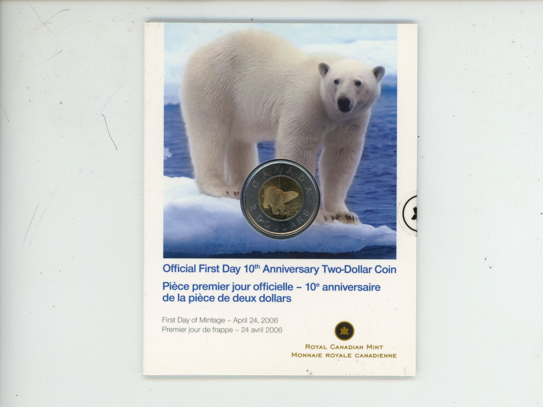 1996 – 2006 Official First Day 10th Anniversary of the Toonie. Housed in its original unopened Royal Canadian Mint packaging.