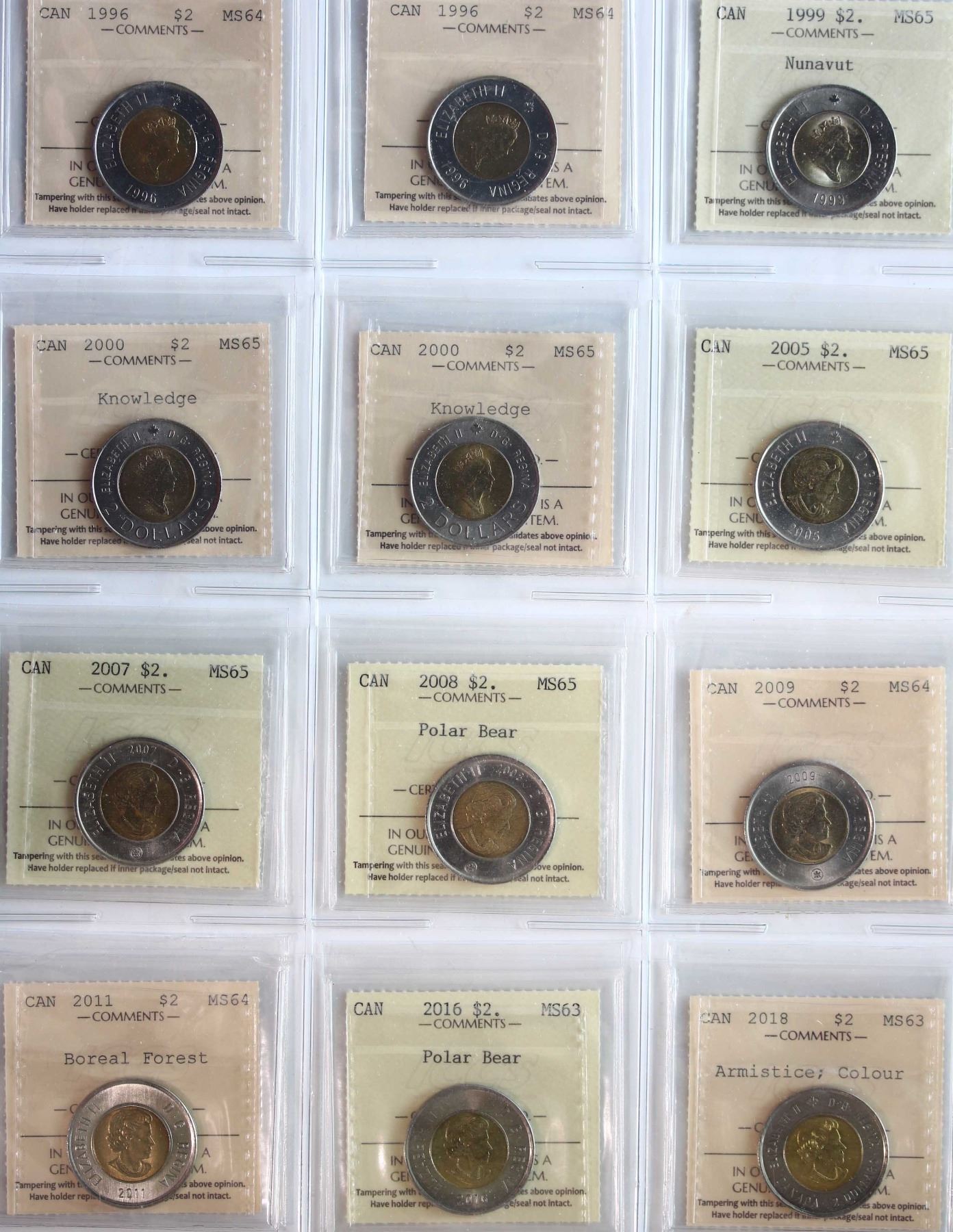 1996-2018 $2 "Twonies" All 12 coins ICCS Choice Mint State-63 to Gem Mint State-65