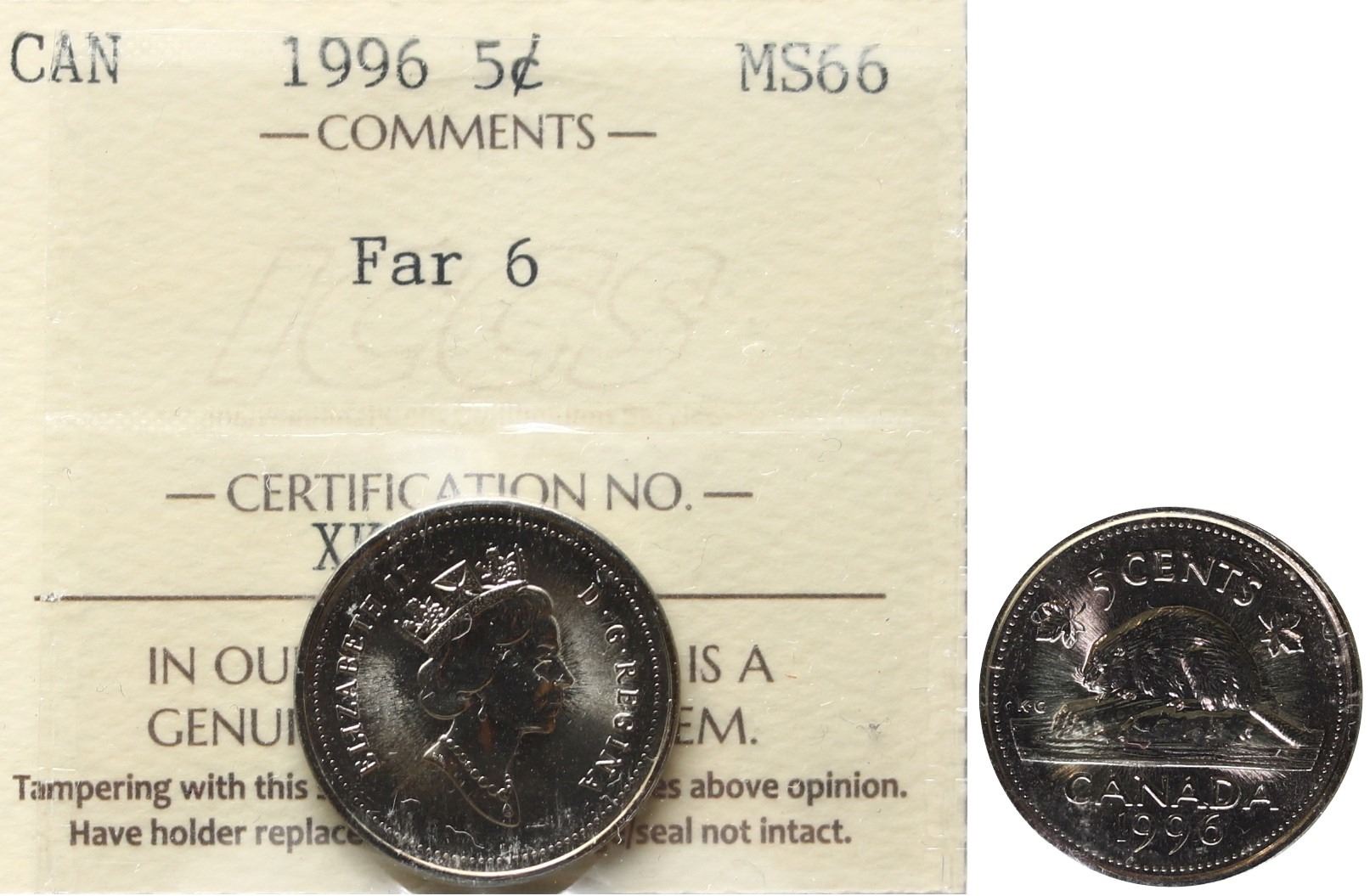 1996 5¢ Far 6 ICCS Superb Gem Mint State-66. Fully lustrous and radiant example. A similar example sold for $448 at our 2024 New Year's sale.