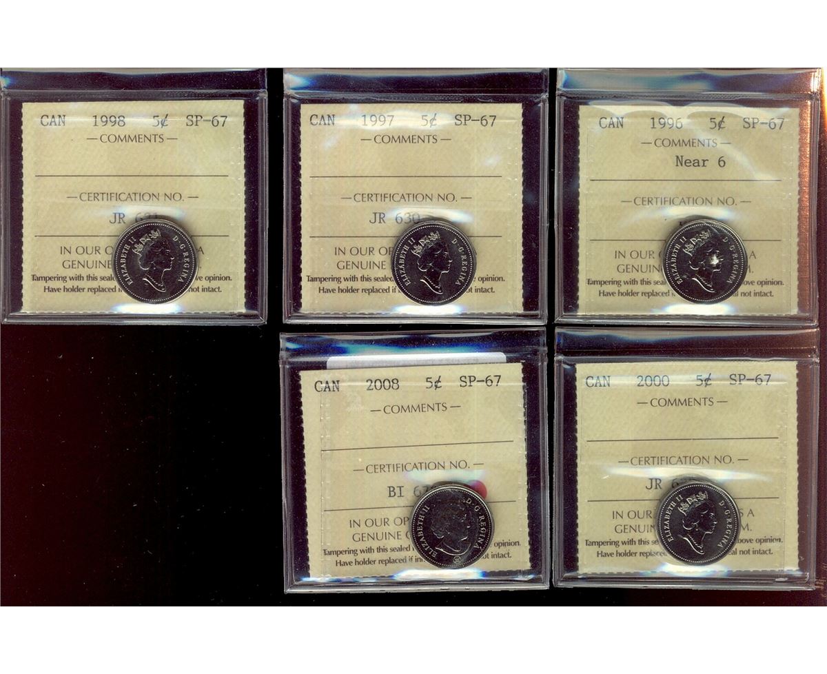 1996 5¢ Nr, 1997, 1998, 2000 & 2008 ICCS SP67. Lot of 5 coins.