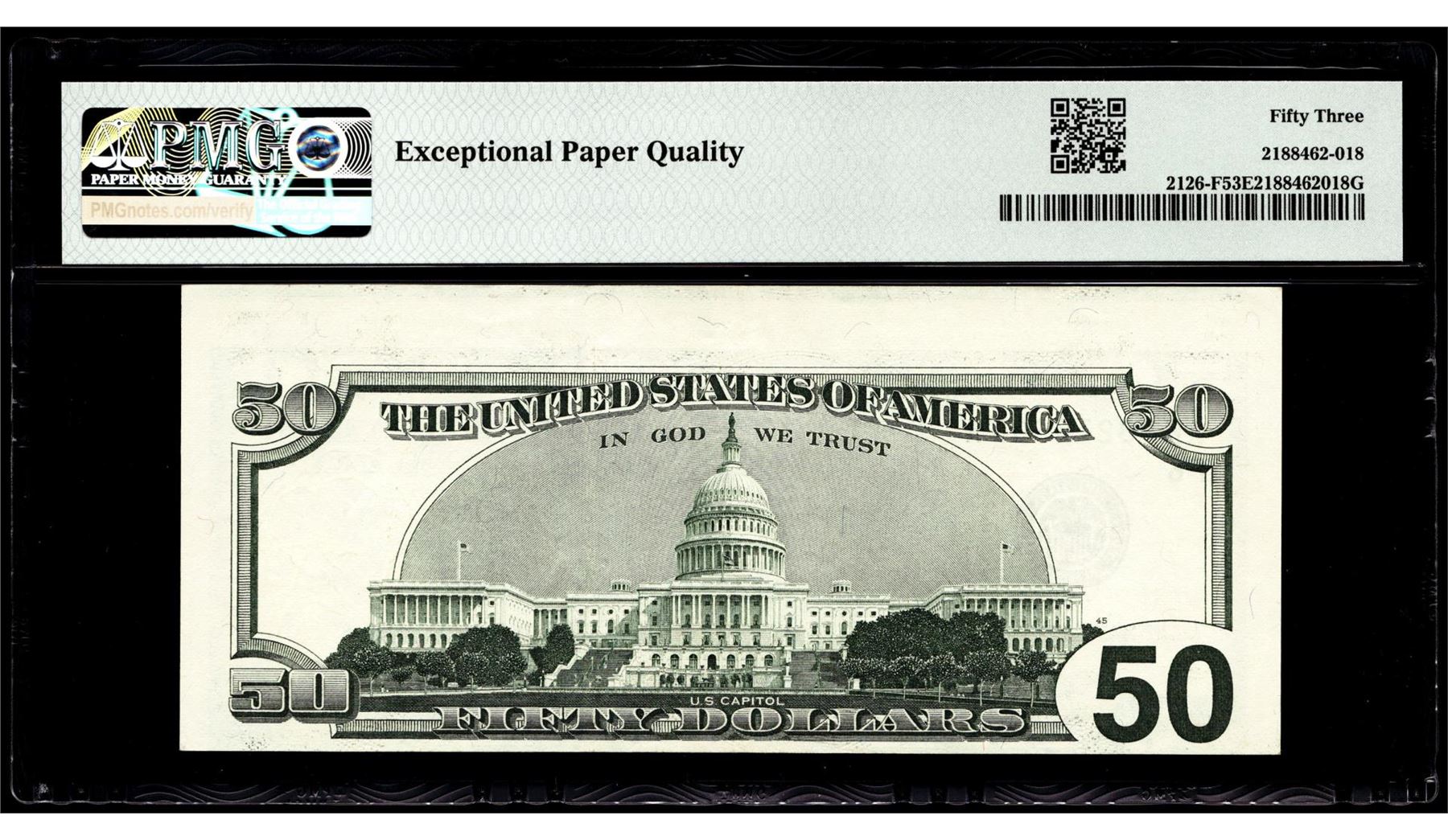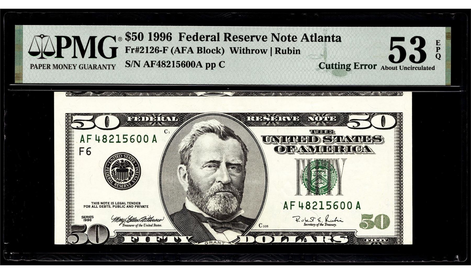 One 1996 $50 Federal Reserve Cutting Error Note Fr.2126-F PMG About Uncirculated 53EPQ. PMG Certified.