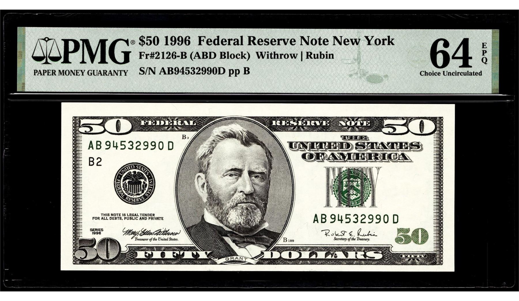 One 1996 $50 Federal Reserve Note New York Fr.2126-B PMG Choice Uncirculated 64EPQ. PMG Certified.
