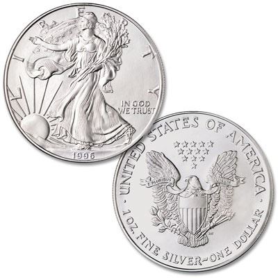 One 1996 American Silver Eagle .999 Fine Silver Dollar Coin.
