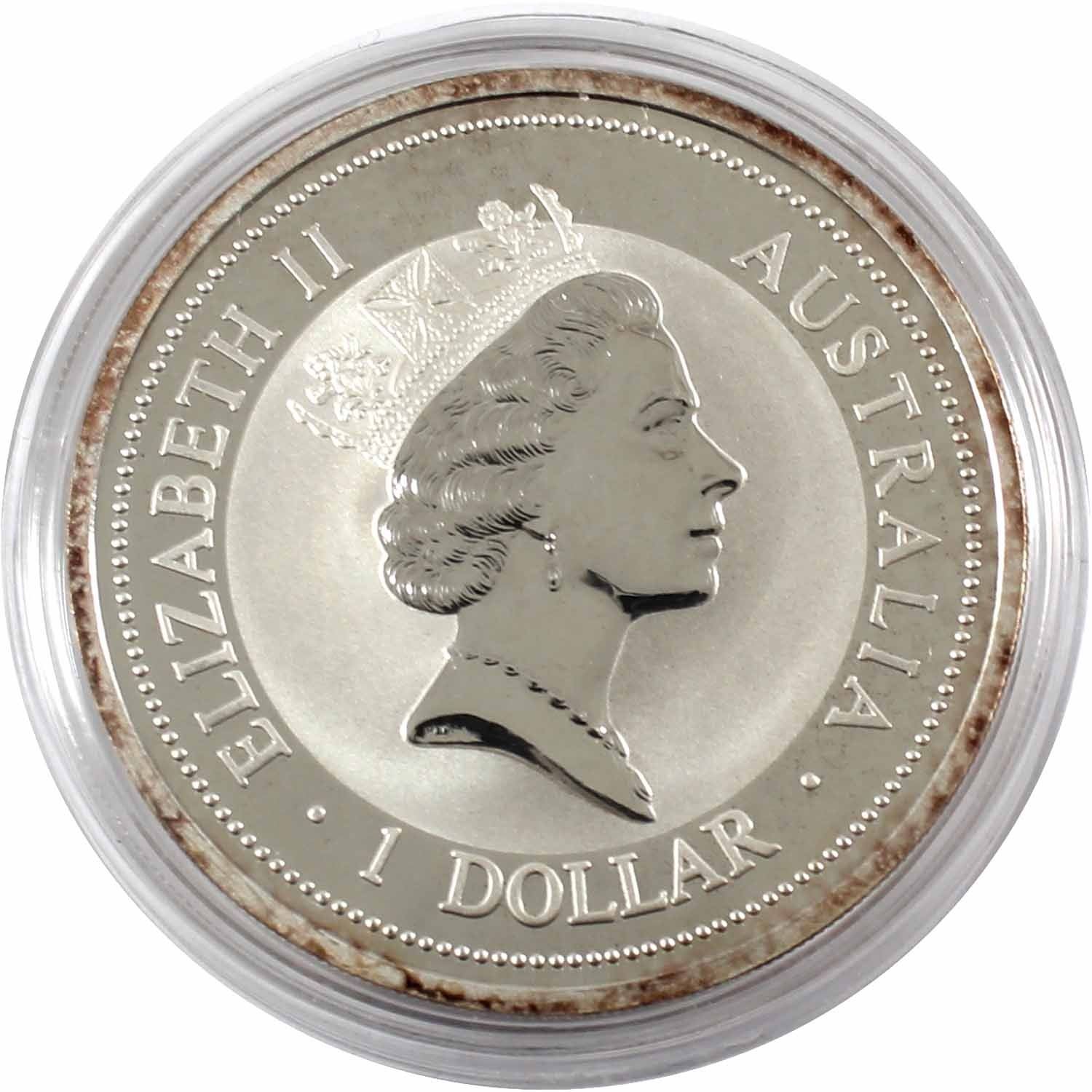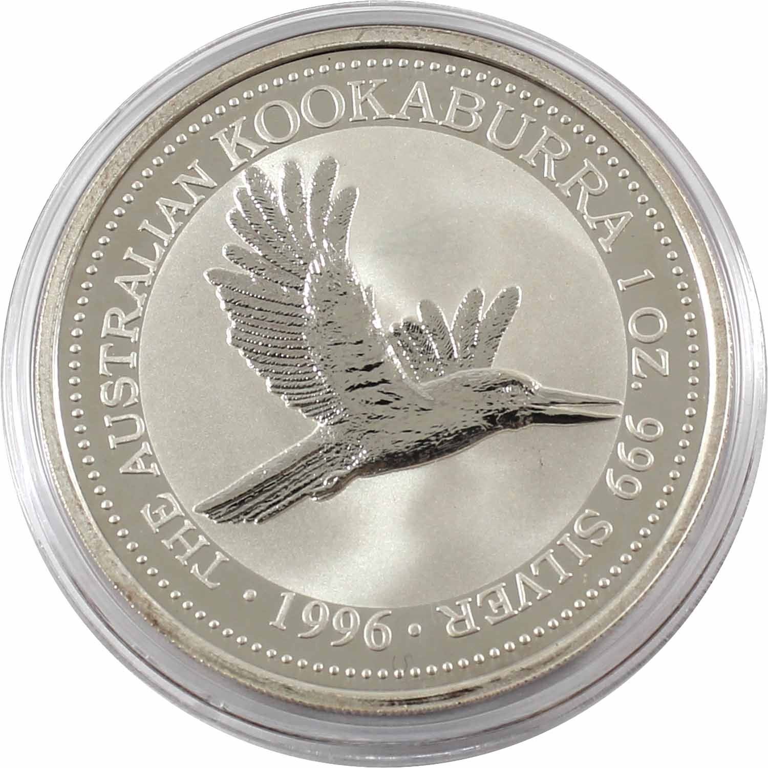 1996 Australia $5 1oz Kookaburra Fine Silver Coin in Capsule (light toning around rim of coin). TAX Exempt