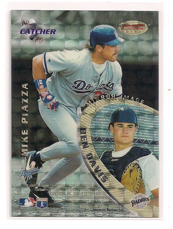 1996 Bowman's Best Mirror Image Atomic Refractor Mike Piazza Parallel Insert Card. This Atomic Refractor pictures Piazza with Ben Davis, Ivan Rodriguez, and Jose Valentin. This card is Near Mint.