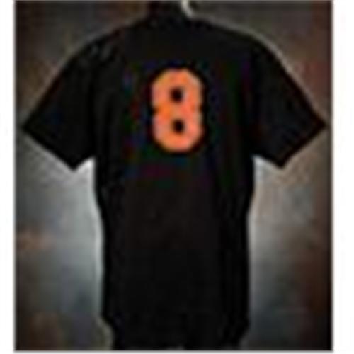 On the front left tail of this mesh batting practice jersey is the "Russell Athletic" size "48" label. Attached below is the "100% Nylon" and "2" Extra Length" tags. Below that is the "1996" year tag. Across the front of the jersey is "ORIOLES" done in orange on black on white triple tackle twill. The player number "8" is on the back also in orange on black on white triple tackle twill. On the right sleeve is the "R" Russell logo. The jersey shows nice wear and appears to have no alterations of any kind.