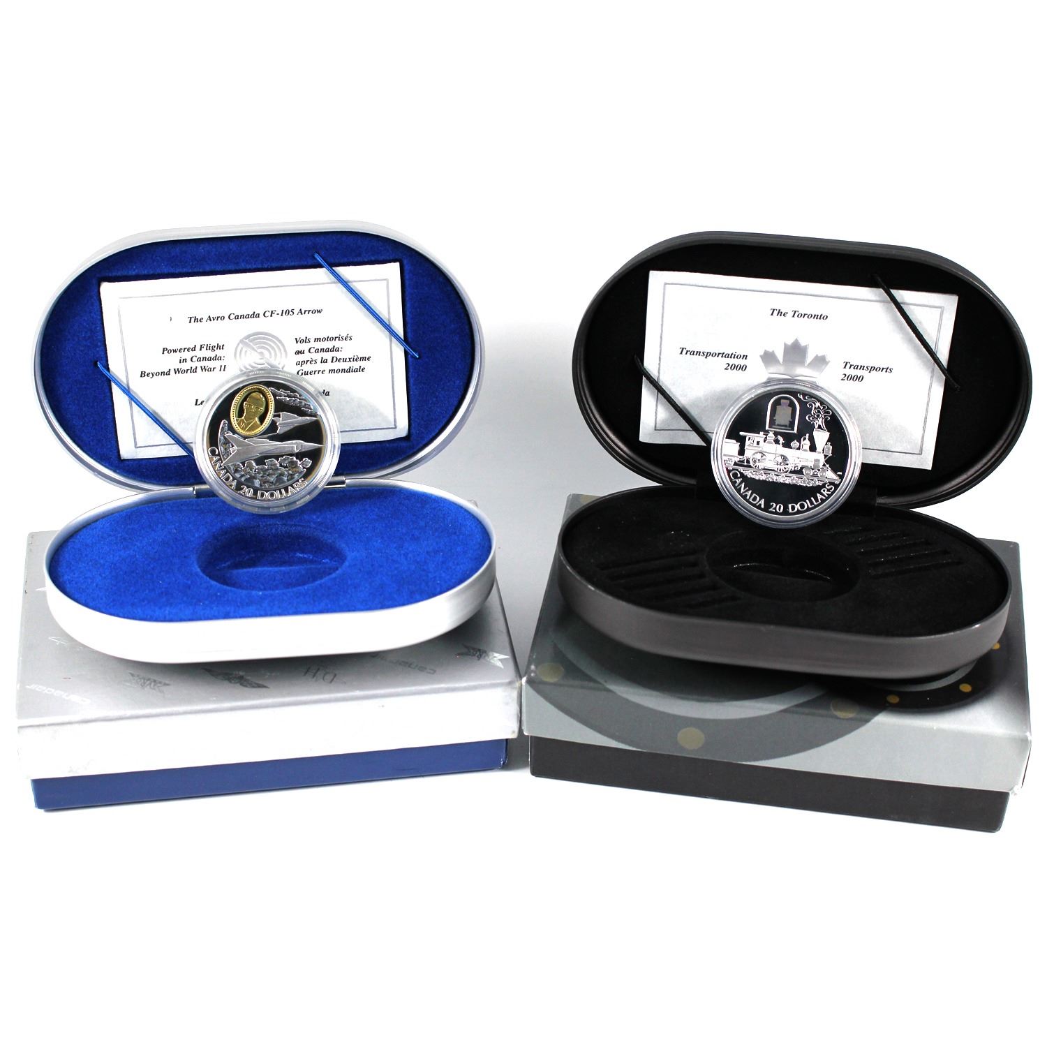1996 Canada $20 Aviation Series - Avro Arrow CF-105 & 2000 $20 Transportation Train - The Toronto Fine Silver Coins (Capsules are scratched). 2pcs (TAX Exempt)