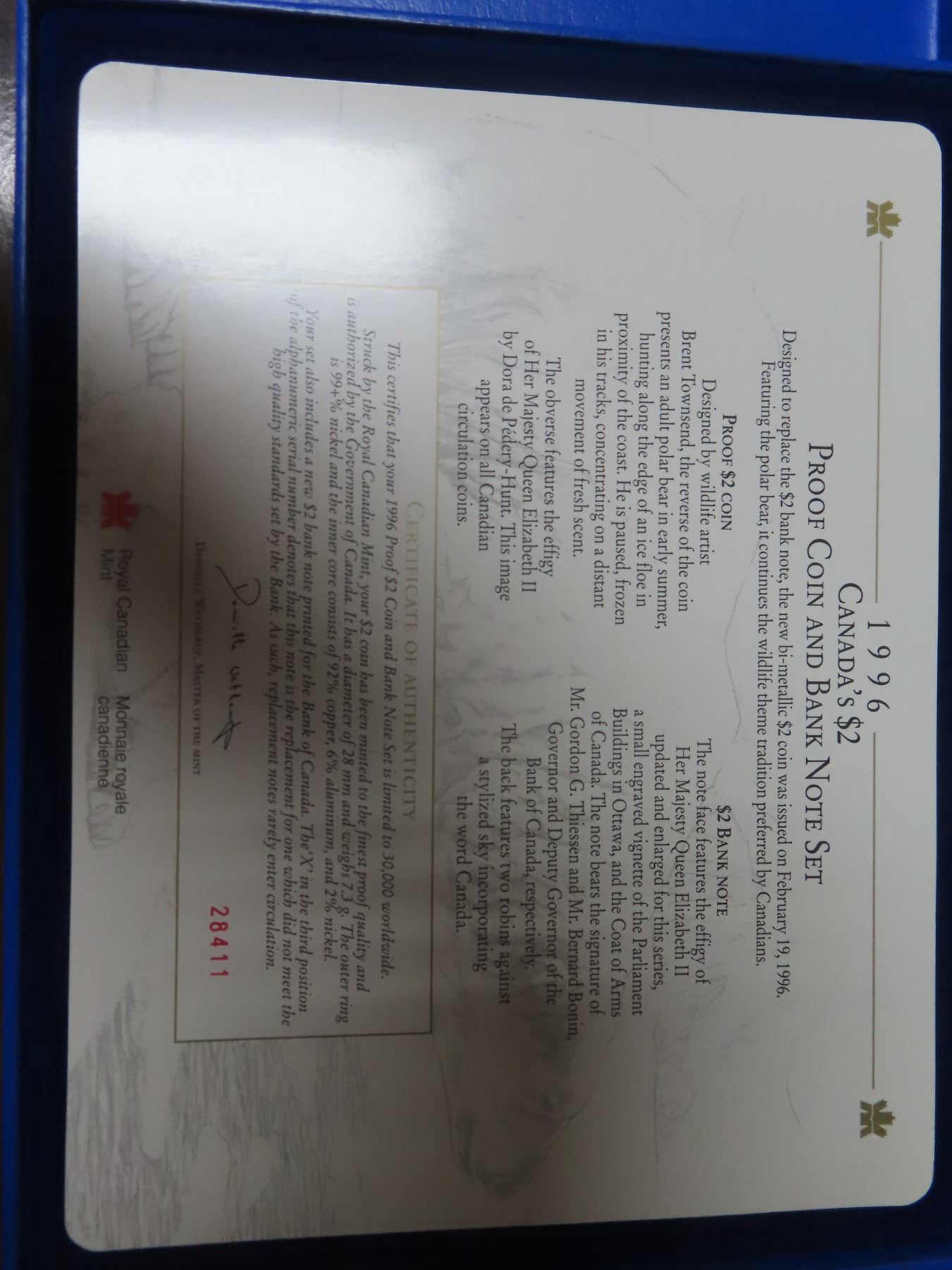 1996 Canada's 2 Dollar Proof Coin & Bank Note Set. Designed to replace the 2 dollar bank note, the Toonie is the first of its kind. Proof with Ultra Heavy Cameo. The 2 dollar note is the Rare BRX Replacement note. Housed in its original Royal Canadian Mint case & box of issue. Includes Certificate of Authenticity