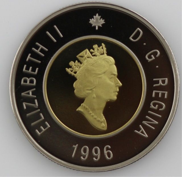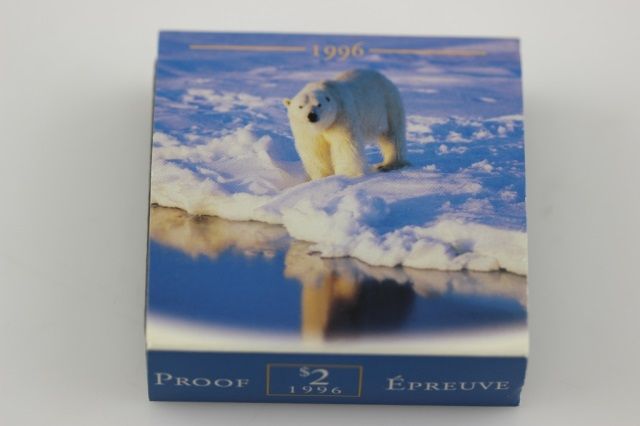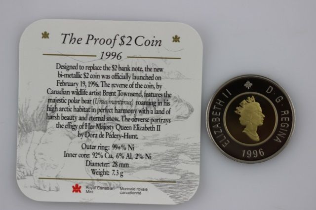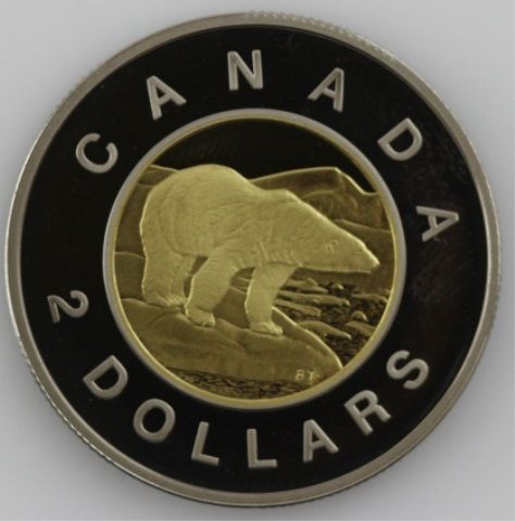 Beautiful Canadian $2 Proof Coin in presentation holder featuring a Polar Bear on one side and the Queen on the other. This coin designed to replace the $2 bank note. Outer ring is 99.4% Ni, inner core is composed of 92% Cu, 6% Al, 2% Ni. Diameter 28mm weight 7.3G