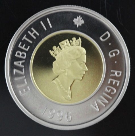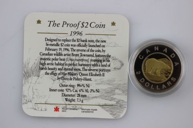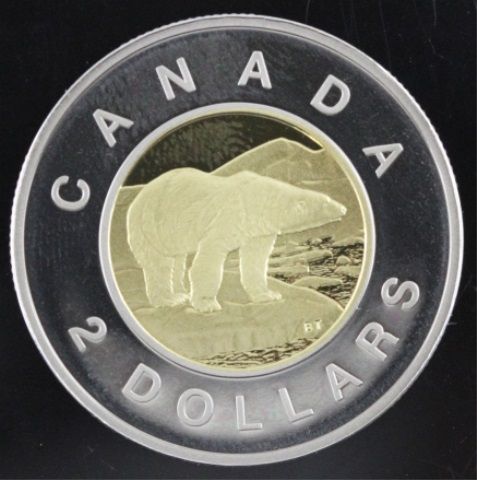 Beautiful Canadian $2 Proof Coin in presentation holder featuring a Polar Bear on one side and the Queen on the other. This coin designed to replace the $2 bank note. Outer ring is 99.4% Ni, inner core is composed of 92% Cu, 6% Al, 2% Ni. Diameter 28mm weight 7.3G