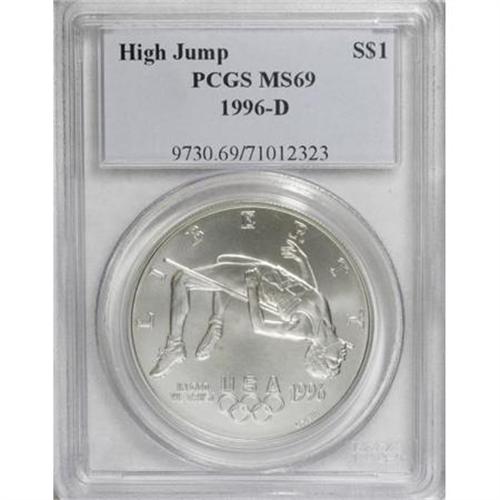 <B>1996-D $1 Olympic/High Jump Silver Dollar MS69 PCGS.</B></I> PCGS Population (431/13). NGC Census: (235/54). Numismedia Wsl. Price for NGC/PCGS coin in MS69: $332. (#9730)<BR><BR><b>Shipping:</b> Coins & Currency (<a target="_blank" href="http://www.heritageauctions.com/common/shipping.php">view shipping information</a>)