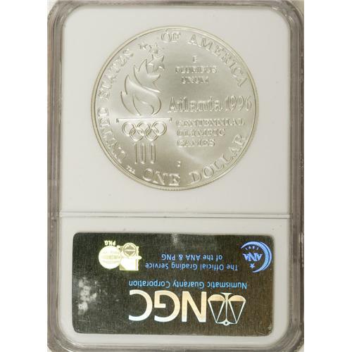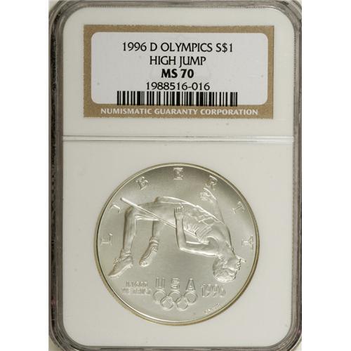 <B>1996-D $1 Olympic/High Jump Silver Dollar MS70 NGC.</B></I> NGC Census: (53/0). PCGS Population (13/0). Numismedia Wsl. Price: $600. (#9730)<BR><BR><b>Shipping:</b> Coins & Currency (<a target="_blank" href="http://www.heritageauctions.com/common/shipping.php">view shipping information</a>)