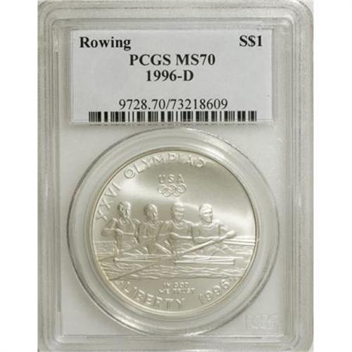 <B>1996-D $1 Olympic/Rowing Silver Dollar MS70 PCGS.</B></I> PCGS Population (31/0). NGC Census: (54/0). Numismedia Wsl. Price for NGC/PCGS coin in MS70: $500. (#9728)<BR><BR><b>Shipping:</b> Coins & Currency (<a target="_blank" href="http://www.heritageauctions.com/common/shipping.php">view shipping information</a>)