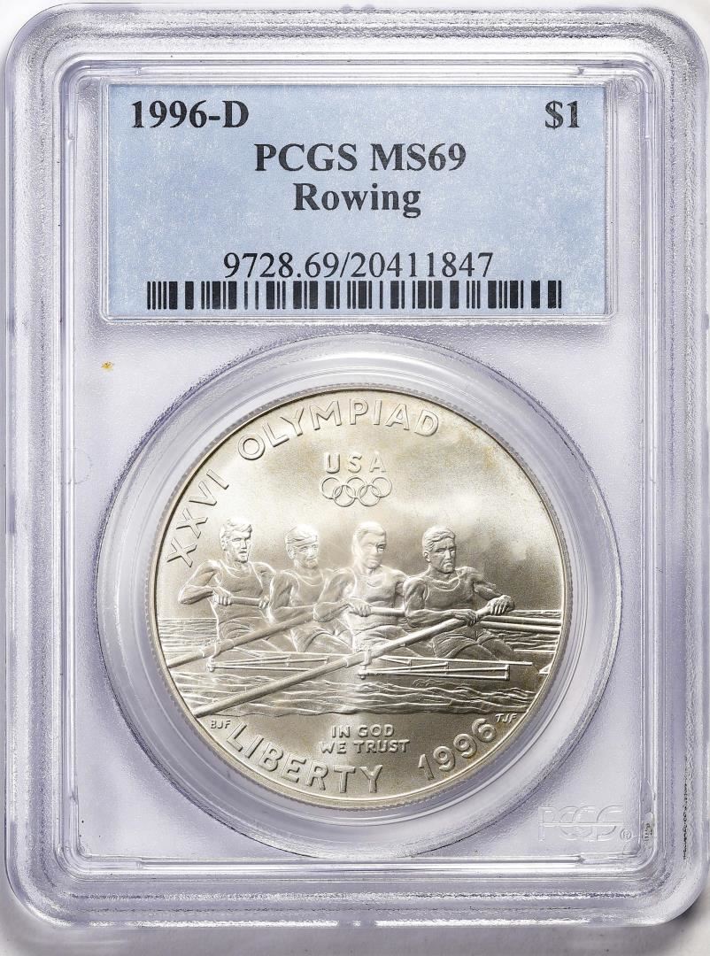 One 1996-D $1 Olympics Rowing Commemorative Silver Dollar Coin PCGS MS69. PCGS Graded.