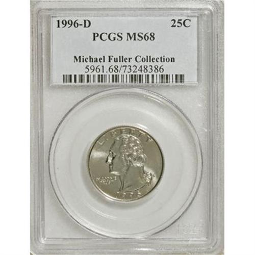 <B>1996-D 25C MS68 PCGS.</B></I> Michael Fuller Collection. PCGS Population (32/0). NGC Census: (4/1). Mintage: 906,867,968. Numismedia Wsl. Price for NGC/PCGS coin in MS68: $260. (#5961)<BR><BR><B>Coin Engraver:</B> John Flanagan<BR><BR><b>Shipping:</b> Coins & Currency (<a target="_blank" href="http://www.heritageauctions.com/common/shipping.php">view shipping information</a>)