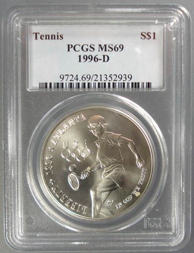 1996-D ATLANTA OLYMPICS TENNIS, COMMEMORATIVE SILVER DOLLAR, PCGS MS69!