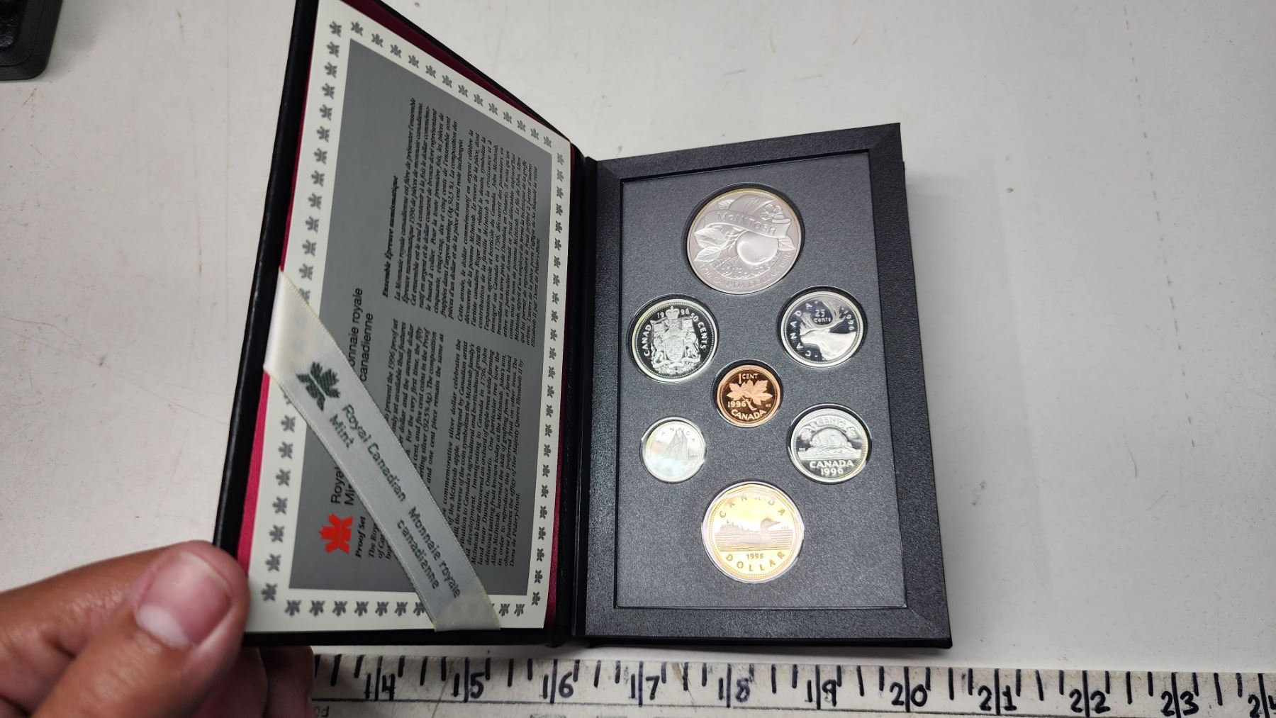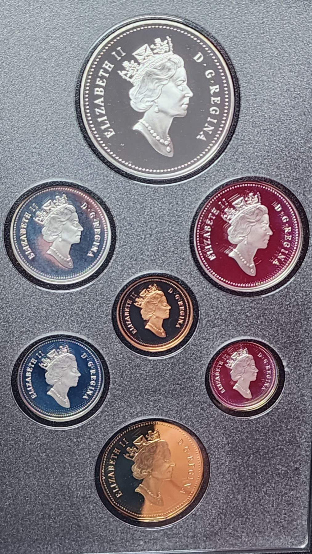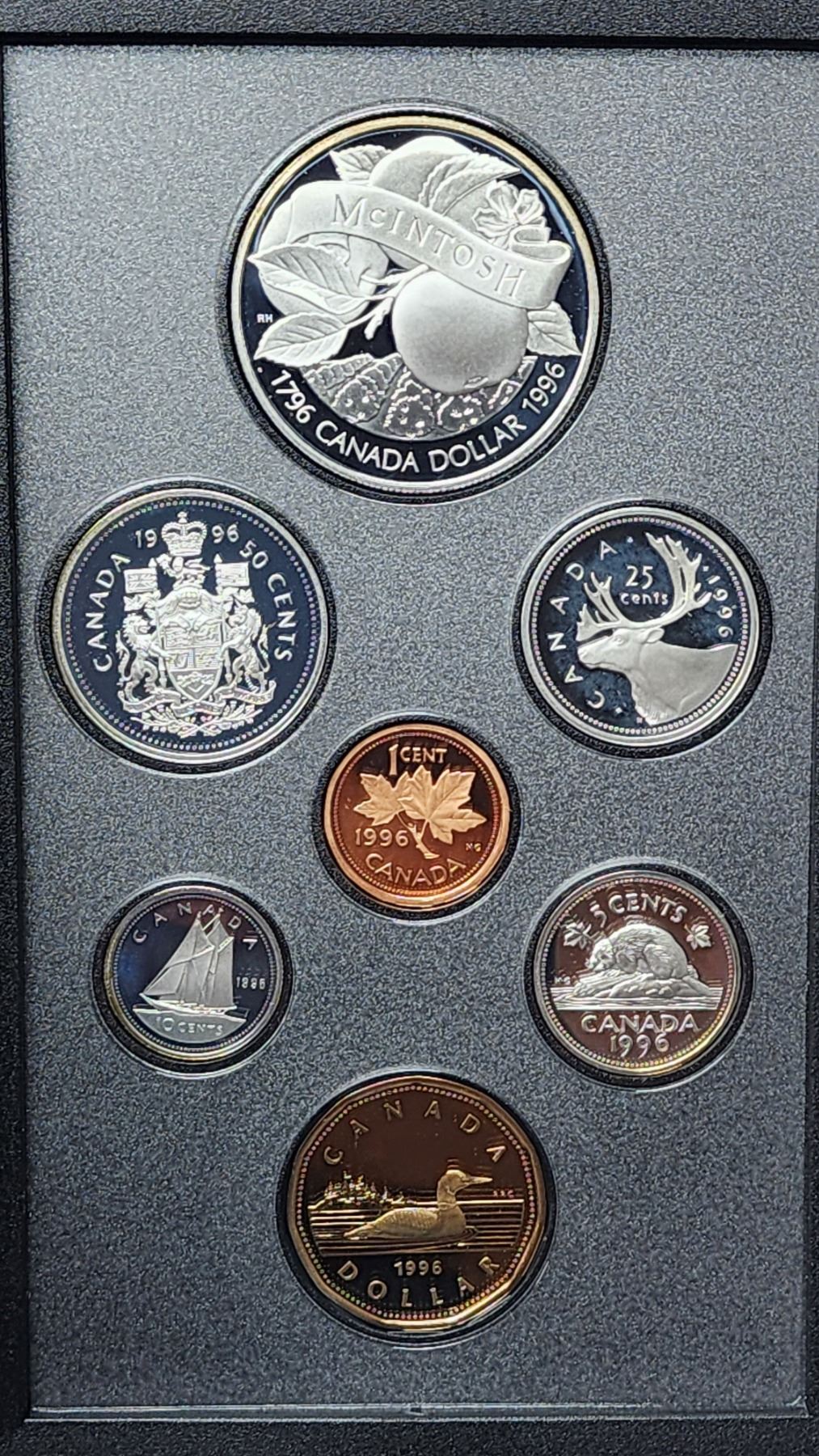1996 Double Dollar Proof Set. Silver Dollar commemorates John McIntosh’s famous apple. For the first time, the 50 Cents, 25 Cents, 10 Cents & 5 Cents are struck in Sterling Silver. Bright White. Ultra Heavy Cameos. Housed in its original RCM case of issue.