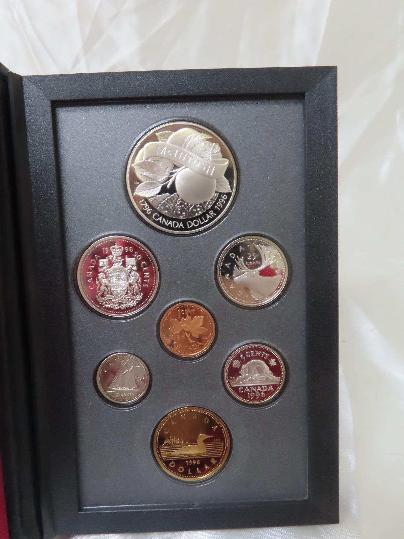 1996 Double Dollar Proof Set. Silver Dollar marks the 200th Anniversary of John McIntosh’s famous apple. 7-coin Proof Set. Most coins are Sterling Silver. All coins have Ultra Heavy Cameos. Housed in its original Royal Canadian Mint case of issue. Includes Certificate of Authenticity.
