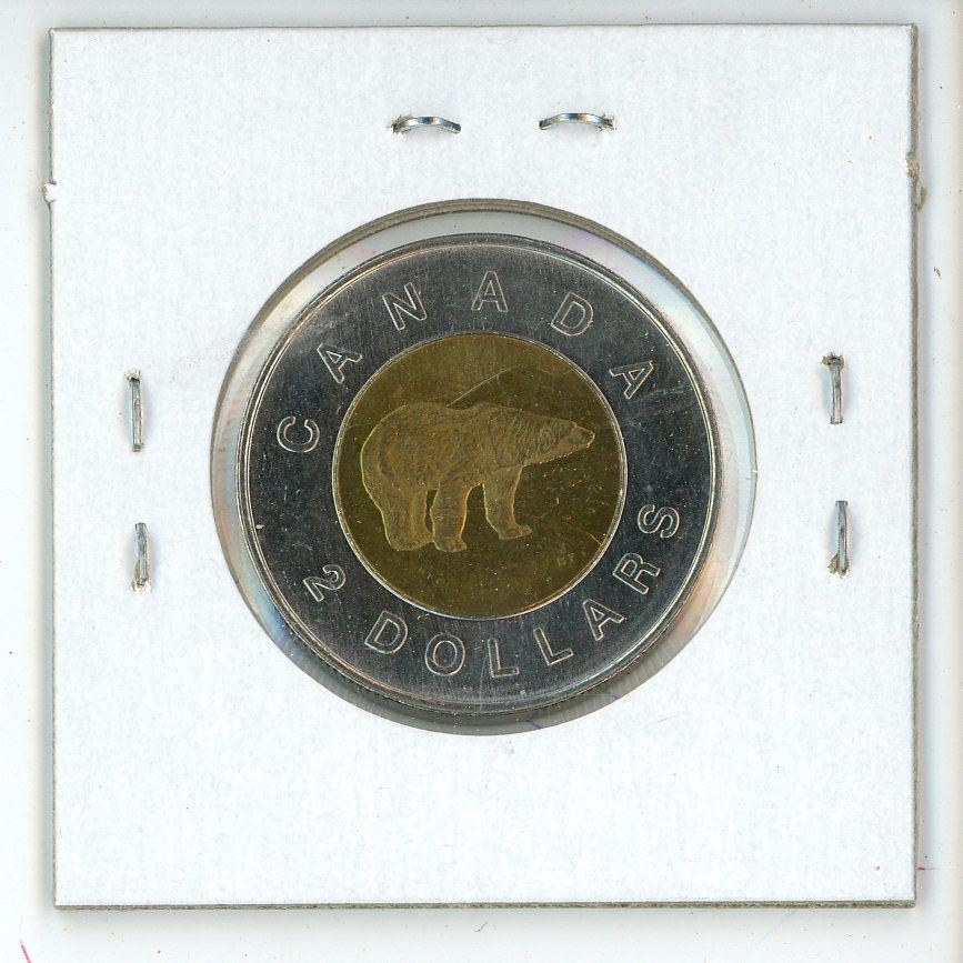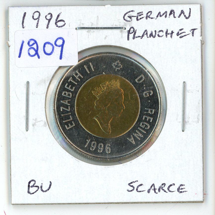 1996 German Planchet $2 Toonie. This planchet was made in Germany and differs from the Canadian planchet in that the coin displays vertical lines through the outer rim. MS-64. Scarce.
