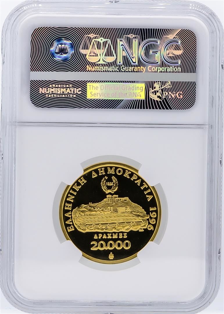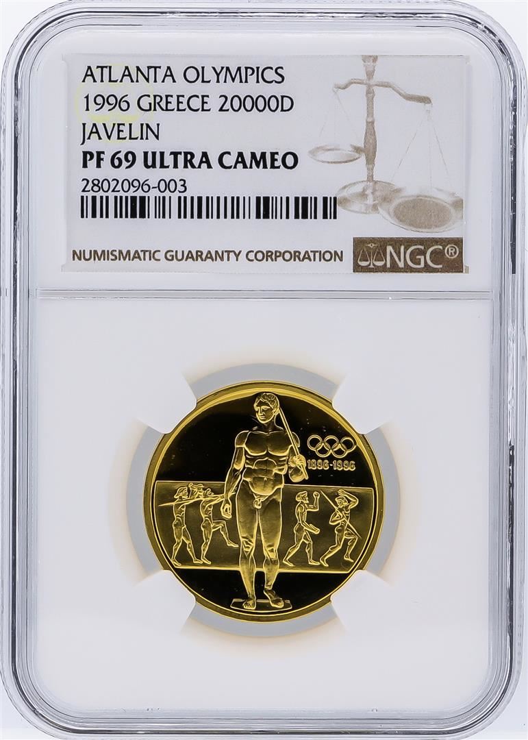 One 1996 Greece 20000D NGC PF69 Ultra Cameo Atlanta Olympics Javelin Gold Coin. NGC Certified.
