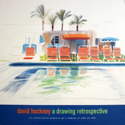 Reference #: ULGH1518 Artist Name: Hockney, David Title: Eight Sunchairs by a Pool Medium: Offset Lithograph Edition Size: limited Year: 1996 Paper Size: 26.75 x 26.75 inches Image Size: 22.25 x 26.75 inches Condition: A: Mint Notes: Original exhibition from Hockney's A Drawing Retrospective held at the Los Angeles County Museum in 1996.
