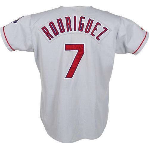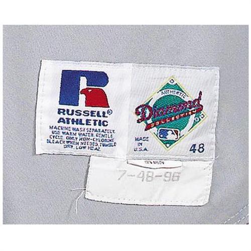 <B>1996 Ivan Rodriguez Game Worn Jersey.</B></I> He's one of the greatest all-around catchers in the game's history, all but a lock for Cooperstown induction one day. Smart collectors will beat the rush and invest in a gamer from this rocket-armed backstop before that day comes, and we're happy to help one of them here. Road grey Rangers jersey announces "Texas" on the chest, with "Rodriguez 7" taking up the rear. Team logo patch is on left sleeve. "Russell Athletic Diamond Collection size 48" label in tail is joined by "100% Nylon" flap tag and "7-48-96" strip tag. Terrific catcher's wear is palpably evident, with extreme pilling to the chest and area where the protective vest was secured. A top specimen to be sure, from the team that Pudge will likely represent in the Hall. <I>LOA from Lou Lampson.</B></I><BR><BR><b>Shipping:</b> Clothing, Costumes & Jerseys (<a target="_blank" href="http://www.heritageauctions.com/common/shipping.php">view shipping information</a>)