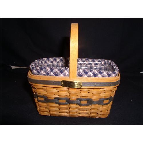 1/8" DBL SPLINT MAPLE STAINED WEAVE W/DARK BLUE AND GREEN ACCENT WEAVING, 1 STATIONARY HANDLE AND BRASS TAG W/NAME AND YEAR