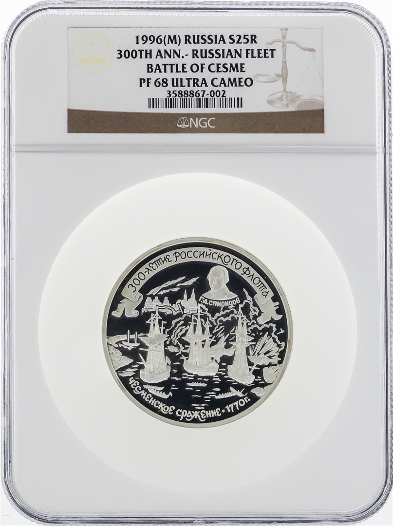 One 1996(M) Russia 25 Roubles 300th Anniversary Silver Proof Coin NGC PF68 Ultra Cameo. NGC Certified.
