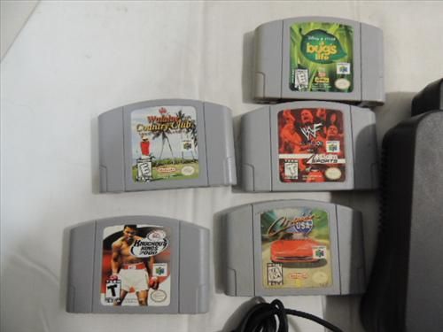 1996 NINTENDO 64 CONSOLE, 2 CONTROLLERS, 5 GAMES AND VIDEO CONNECTORS. GAMES: BUGS LIFE, WF ATTITUDE, CRUIS'N, KNOCKOUT KINGS 2000, TRUE GOLF . AS SHOWN. VIEW PICTURE FOR DETAIL.