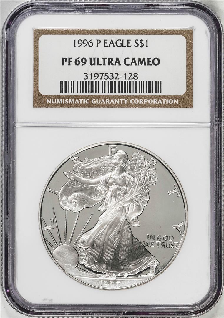One 1996-P $1 Proof American Silver Eagle Coin NGC PF69 Ultra Cameo. NGC Certified.