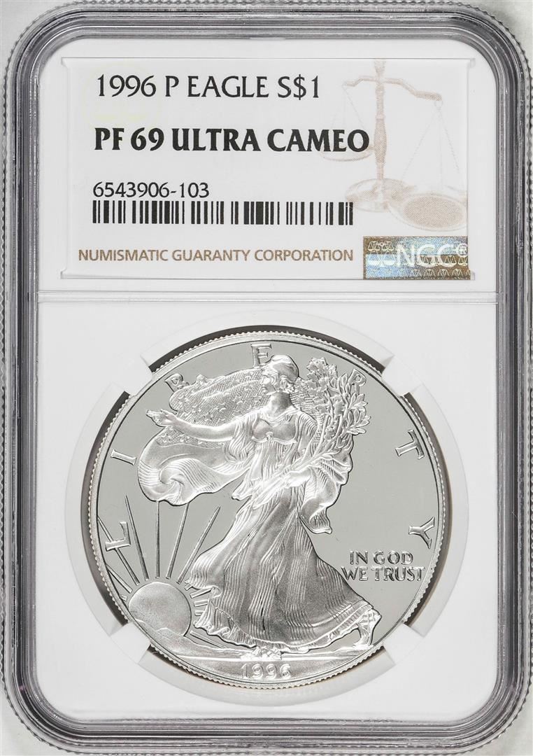 One 1996-P $1 Proof American Silver Eagle Coin NGC PF69 Ultra Cameo. NGC Certified.
