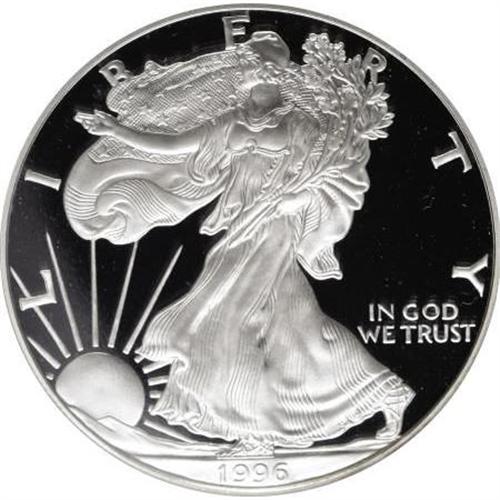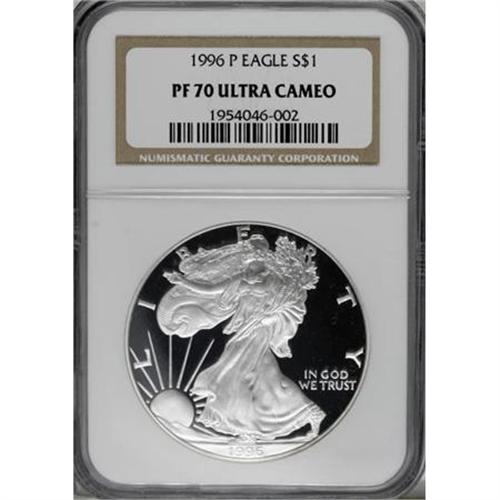 <B>1996-P $1 Silver Eagle PR70 Deep Cameo NGC.</B></I> NGC Census: (273/0). PCGS Population (53/0). Numismedia Wsl. Price for NGC/PCGS coin in PR70: $725. (#9910)<BR><BR><b>Shipping:</b> Coins & Currency (<a target="_blank" href="http://www.heritageauctions.com/common/shipping.php">view shipping information</a>)