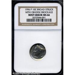 <B>1996-P 10C Roosevelt Dime--Broadstruck with Obverse Brockage--MS66 NGC.</B></I> The obverse brockage appears as a 20% indent at 1 o'clock. Fully lustrous light gray surfaces. Lot:10988