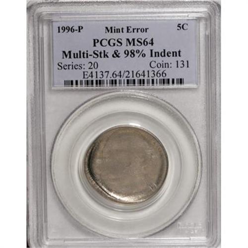 <B>1996-P 5C Jefferson Nickel--Multiple Struck & 98% Indent--MS64 PCGS.</B></I> This coin adhered to the reverse die, and was struck a few times, moderately spreading without wrapping around the reverse die. A planchet (not included) was fed between strikes, indenting nearly all of the obverse, although a sliver of IN GOD WE TRUST had expanded beyond the diameter of the fed flan.<BR><BR><B>Coin Engraver:</B> Felix Schlag<BR><BR><b>Shipping:</b> Coins & Currency (<a target="_blank" href="http://www.heritageauctions.com/common/shipping.php">view shipping information</a>)