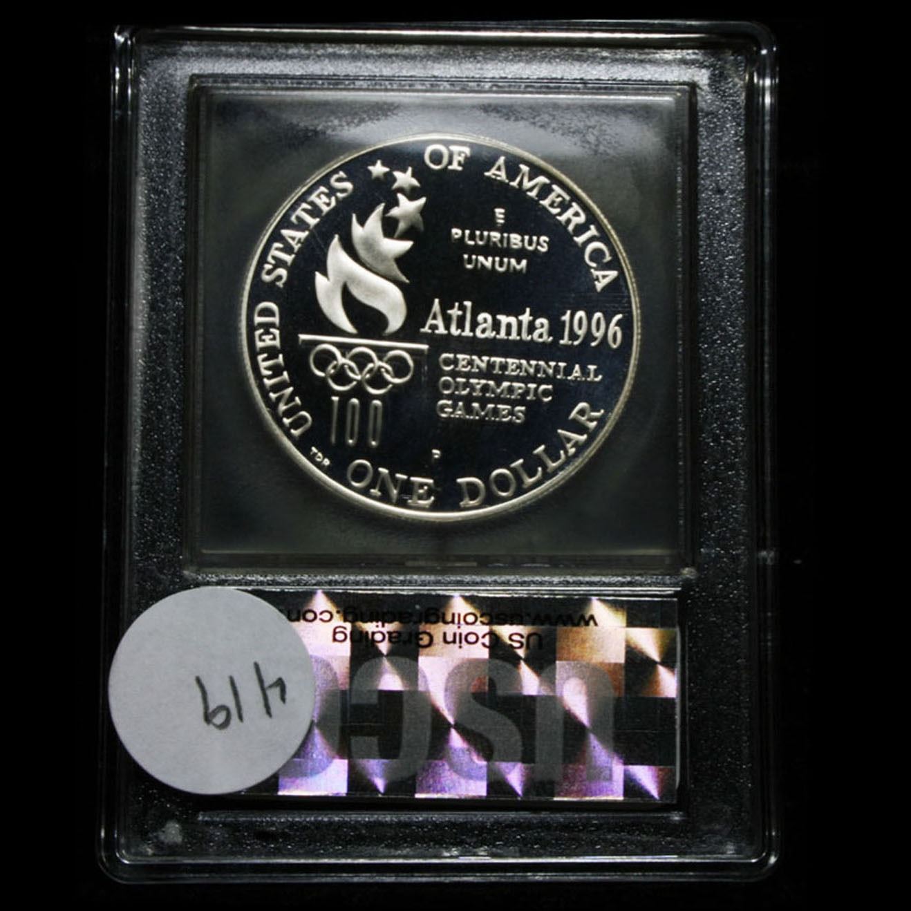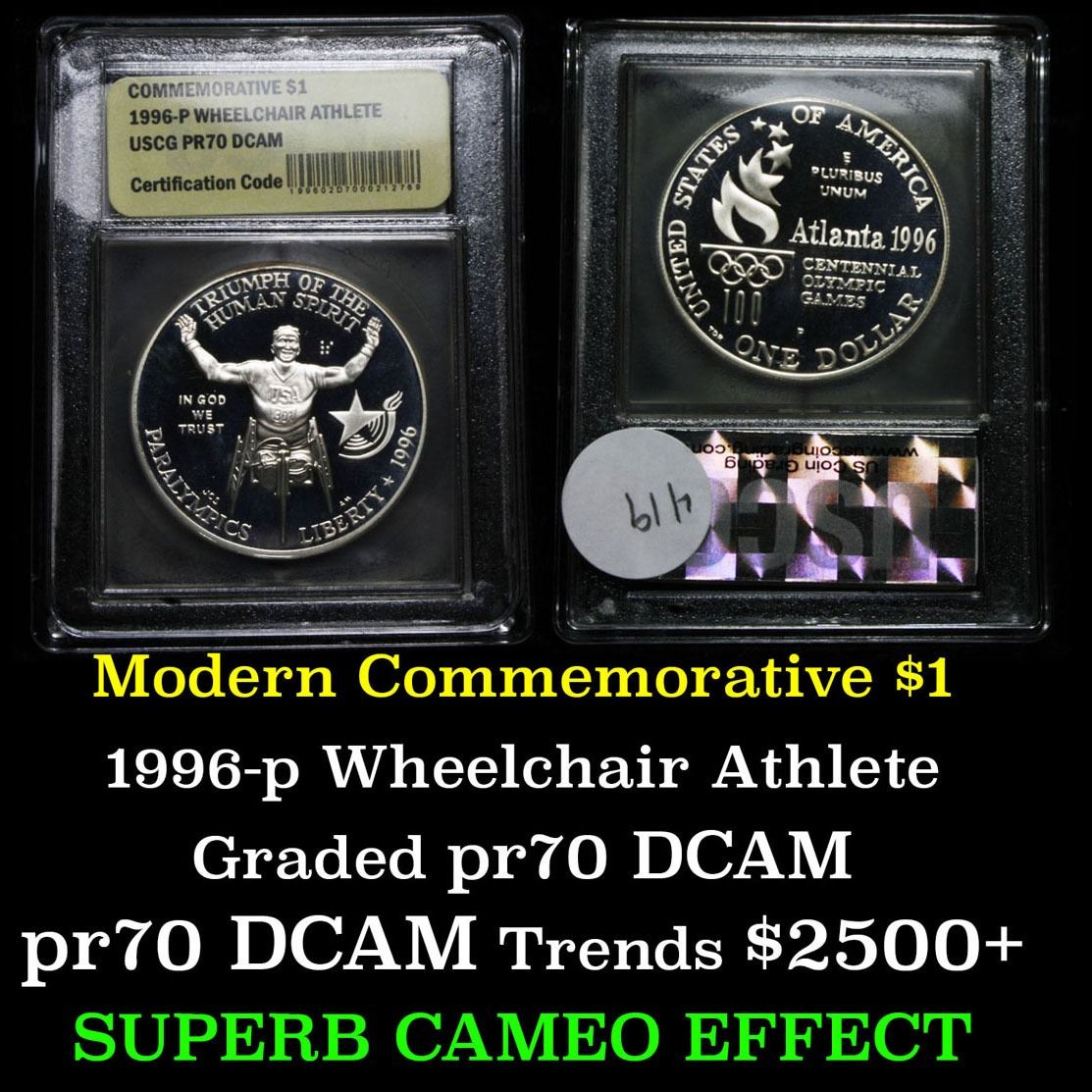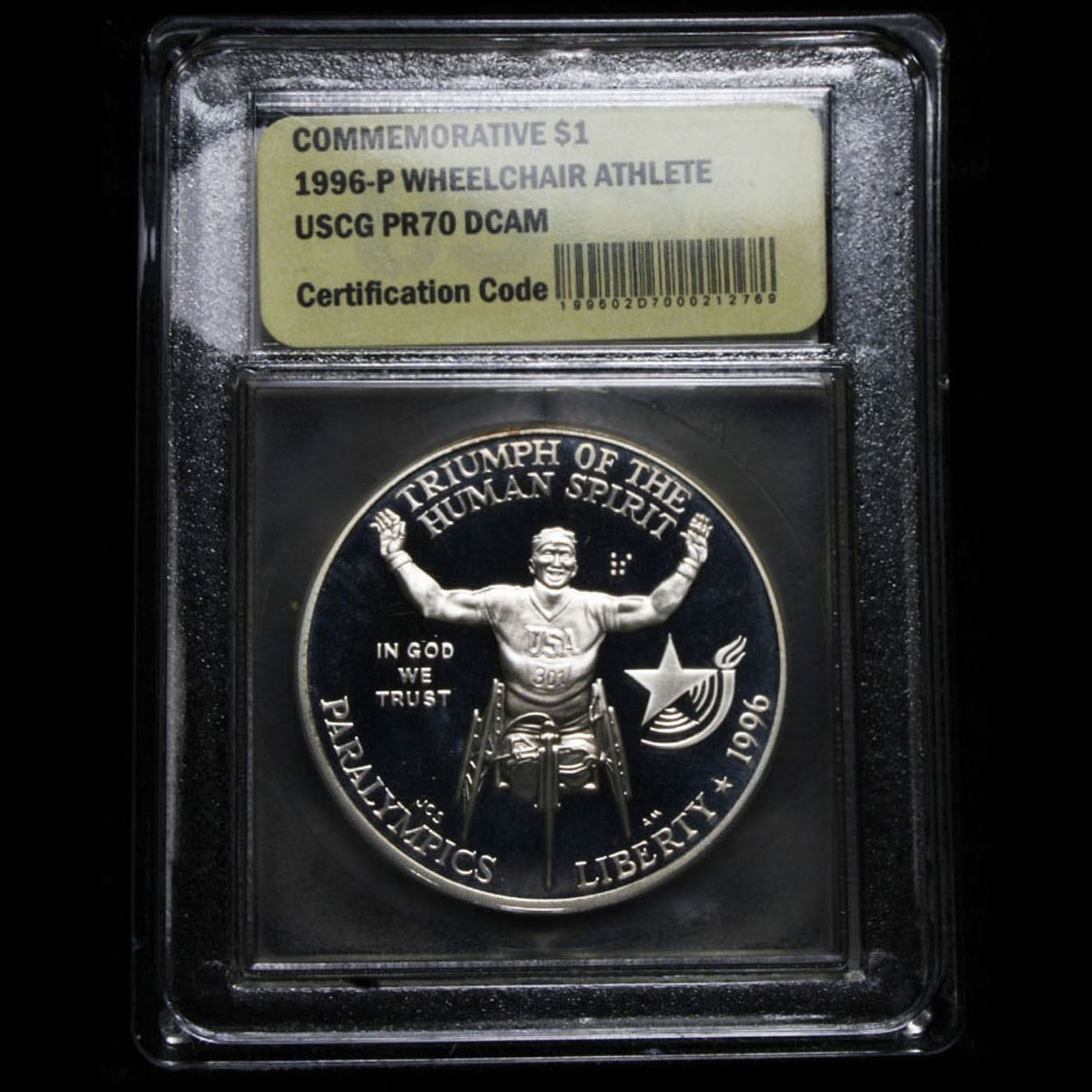 1996-P Oly Paralympics (Wheel Chair Athlete) . . Modern Commem Dollar $1 Graded Gem++ Proof DCAM by USCG. The 1996 Paralympics Silver Dollar was issued as part of an extensive program of commemorative coins for the XXVI Olympiad held in Atlanta, Georgia. There were a total of sixteen different coins issued for the program over the course of two years. This Perfect coin is graded Perfection Gem+++ Proof Deep cameo by USCG.