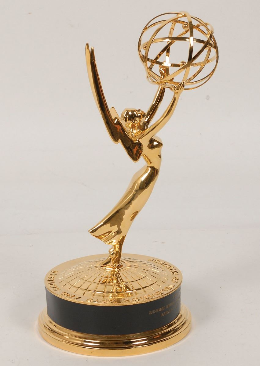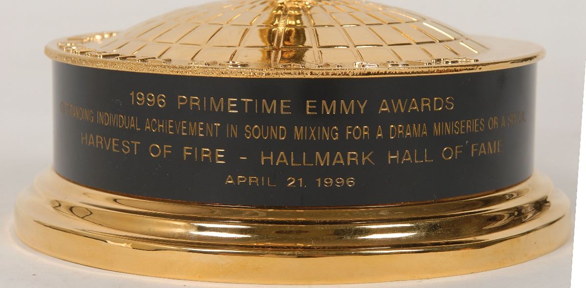 Iconic original Primetime Emmy statuette awarded to the audio crew of Harvest of Fire in 1996. The award trophy measures approximately 15? tall with a base diameter of 7.5?, weighs 5.8 pounds, and is neatly engraved on the base, “1996 Primetime Emmy Awards, Outstanding Individual Achievement in Sound Mixing for a Drama, Miniseries or a Special, Harvest of Fire—Hallmark Hall of Fame, April 21, 1996.” In very fine condition. A wonderful example of this sought-after prize.