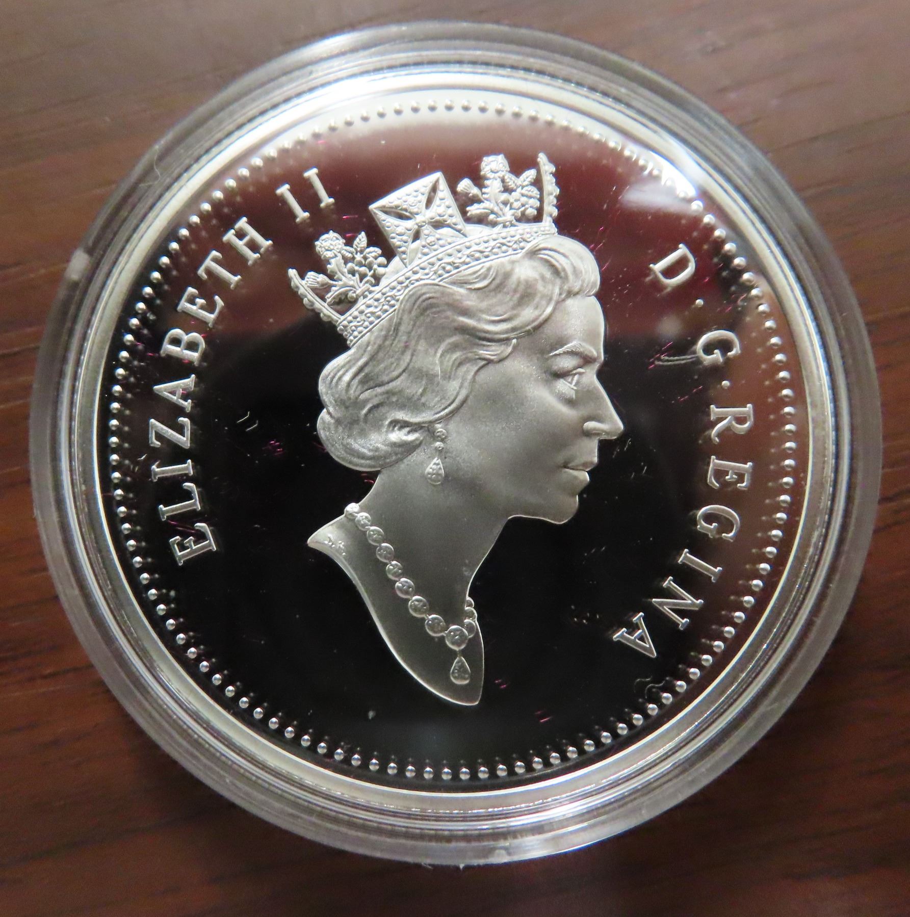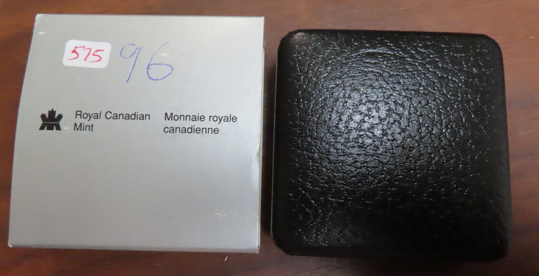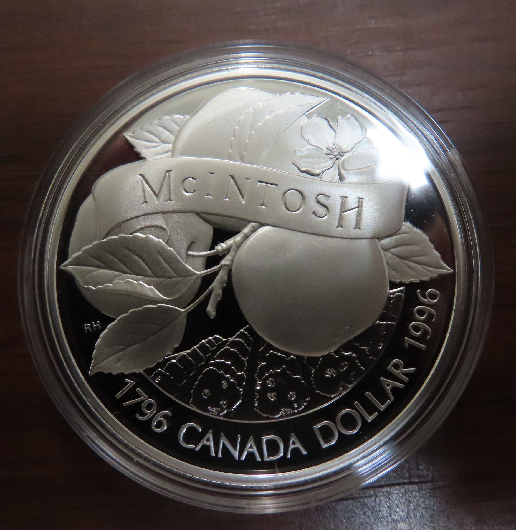 1996 Proof Silver Dollar. Commemorates the 200th Anniversary of John McIntosh’s famous apple. Housed in its original Royal Canadian Mint case of issue. Bright White.