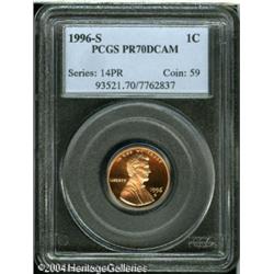 1996-S 1C PR70 Deep Cameo PCGS. An outstanding pie <B>1996-S 1C PR70 Deep Cameo PCGS.</B></I> An outstanding piece, the strike is pinpoint-sharp and the mirrored fields are undisturbed and impressive. Population: 47 in 70 (10/04). <BR><BR><B>Important notice:</B> Heritage usually auctions material at the rate of 200-250 lots per hour. On some occasions eBay Live bid software or the Internet may not be able to keep up with the pace of the auction. We recommend placing a realistic absentee bid now as insurance to avoid disappointment. Occasionally the auctioneer may eliminate or reject an eBay Live bid, and the auctioneer may also reopen a lot after the close of the eBay live bidding (usually because we missed an audience bid), and may reject your bid even if it shows you as the winning bidder. By bidding via eBay Live, you agree that Heritage may award the lot to another bidder at its sole discretion under the circumstances described above or any other reasonable circumstances. Since eBay bids are not shown to us until we open the lot on the floor, we treat those bids just like floor bids. In most cases the floor responds before the eBay bid is presented to us, due to Internet lag time, so for consistency we have made it a policy that floor bids are always considered first over tie eBay live bids. Also please note that all Heritage lots purchased through eBay Live carry a 20% Buyer's Premium. Please make sure you read the Terms and Conditions before you bid. This lot is being auctioned in conjunction with a live floor auction by Heritage Galleries & Auctioneers. All final auction and invoice information will be supplied by Heritage Galleries & Auctioneers, and all other information should be considered preliminary. Lot:5463