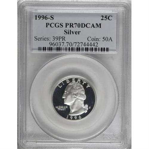 <B>1996-S 25C Silver PR70 Deep Cameo PCGS.</B></I> PCGS Population (46/0). NGC Census: (48/0). Numismedia Wsl. Price for NGC/PCGS coin in PR70: $180. (#96037)<BR><BR><b>Shipping:</b> Coins & Currency (<a target="_blank" href="http://www.heritageauctions.com/common/shipping.php">view shipping information</a>)