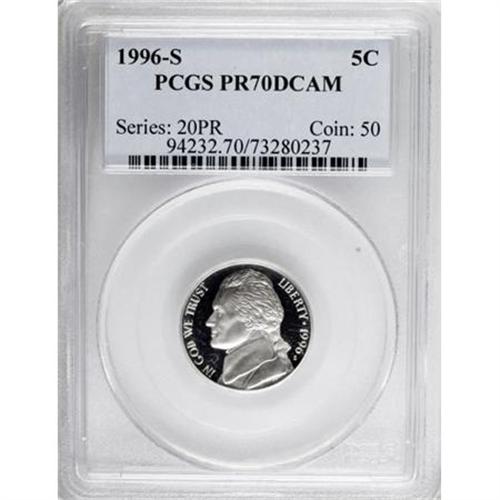 <B>1996-S 5C PR70 Deep Cameo PCGS.</B></I> PCGS Population (61/0). NGC Census: (118/0). Numismedia Wsl. Price for NGC/PCGS coin in PR70: $180. (#94232)<BR><BR><b>Shipping:</b> Coins & Currency (<a target="_blank" href="http://www.heritageauctions.com/common/shipping.php">view shipping information</a>\)