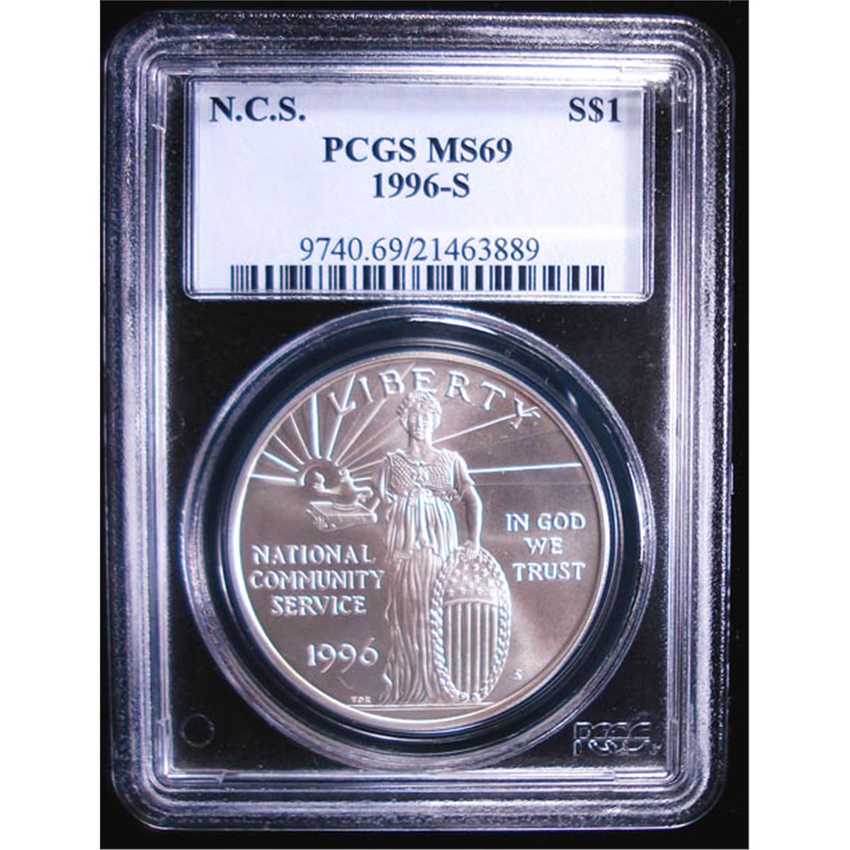 1996-S NATIONAL COMMUNITY SERVICE COMMEMORATIVE SILVER DOLLAR, PCGS MS69!