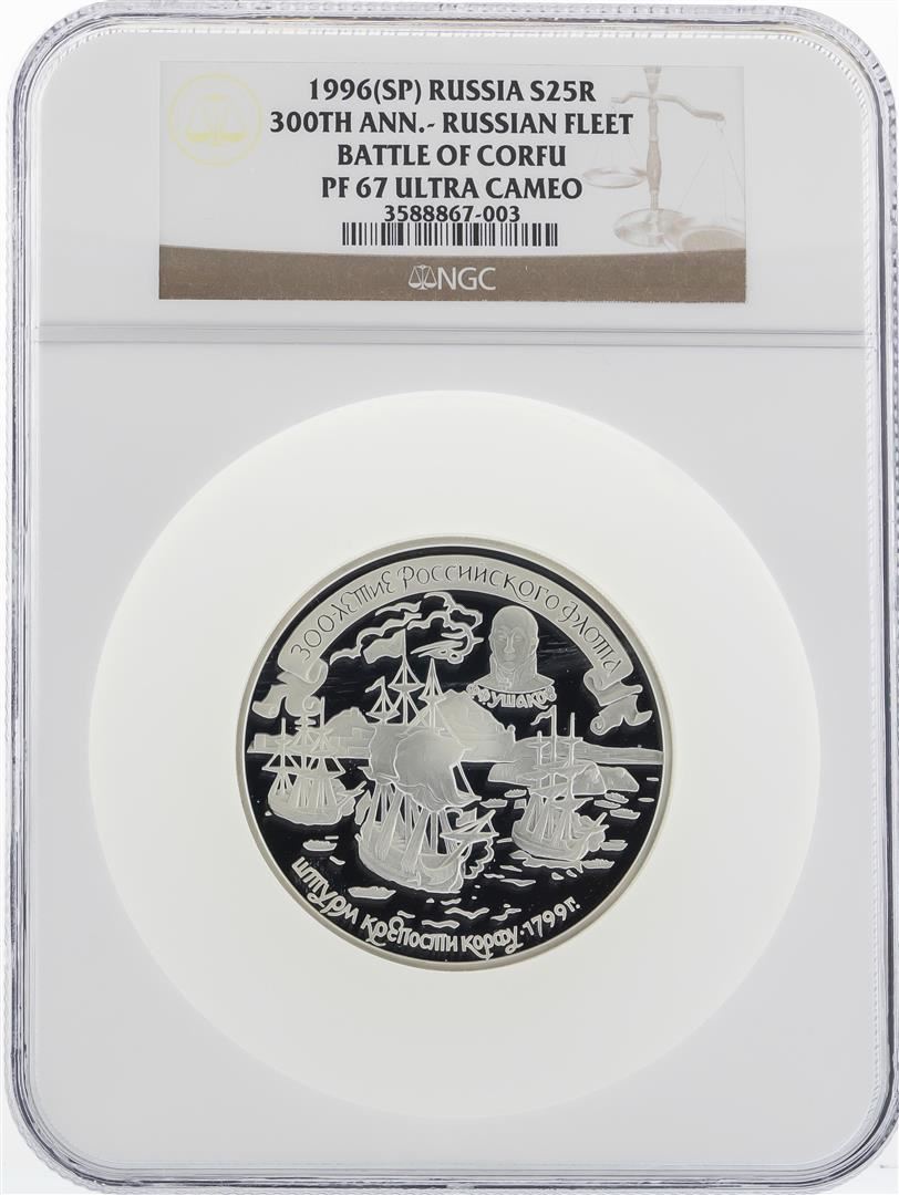 One 1996(SP) Russia 25 Roubles 300th Anniversary Silver Proof Coin NGC PF67 Ultra Cameo. NGC Certified.