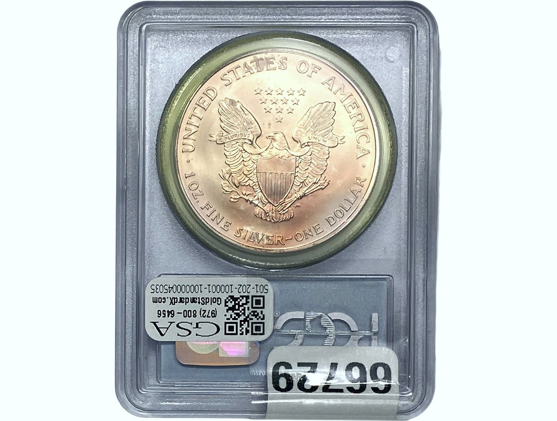 e. Coins sold referencing a third-party grading service are sold “AS IS” without any express or implied warranty, except for a guarantee by GSA that they are genuine. Removal or alteration of the holder, voids all of Bidder’s claims concerning that Product. Certain warranties may be available from the grading services and Bidders are referred to them for further details: Numismatic Guaranty Corporation (NGC), PO Box 4776, Sarasota, FL 34230, www.ngccoin.com/services/writtenguarantee.asp; Professional Coin Grading Services (PCGS), PO Box 9458, Newport Beach, CA 92658, www.pcgs.com/guarantee.html; ANACS, 6555 S. Kenton St., Ste. 303, Englewood, CO 80111; and Independent Coin Grading Co. (ICG), 7901 East Bellview, Ave., Suite 50, Englewood, CO 80111.