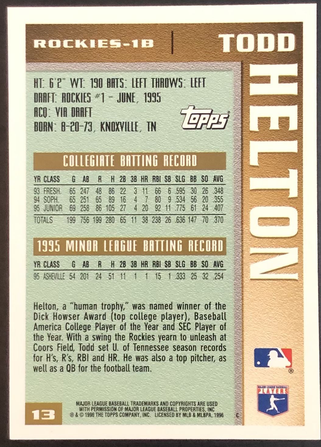 Card #13 MLB, baseball, rookie, hall of fame