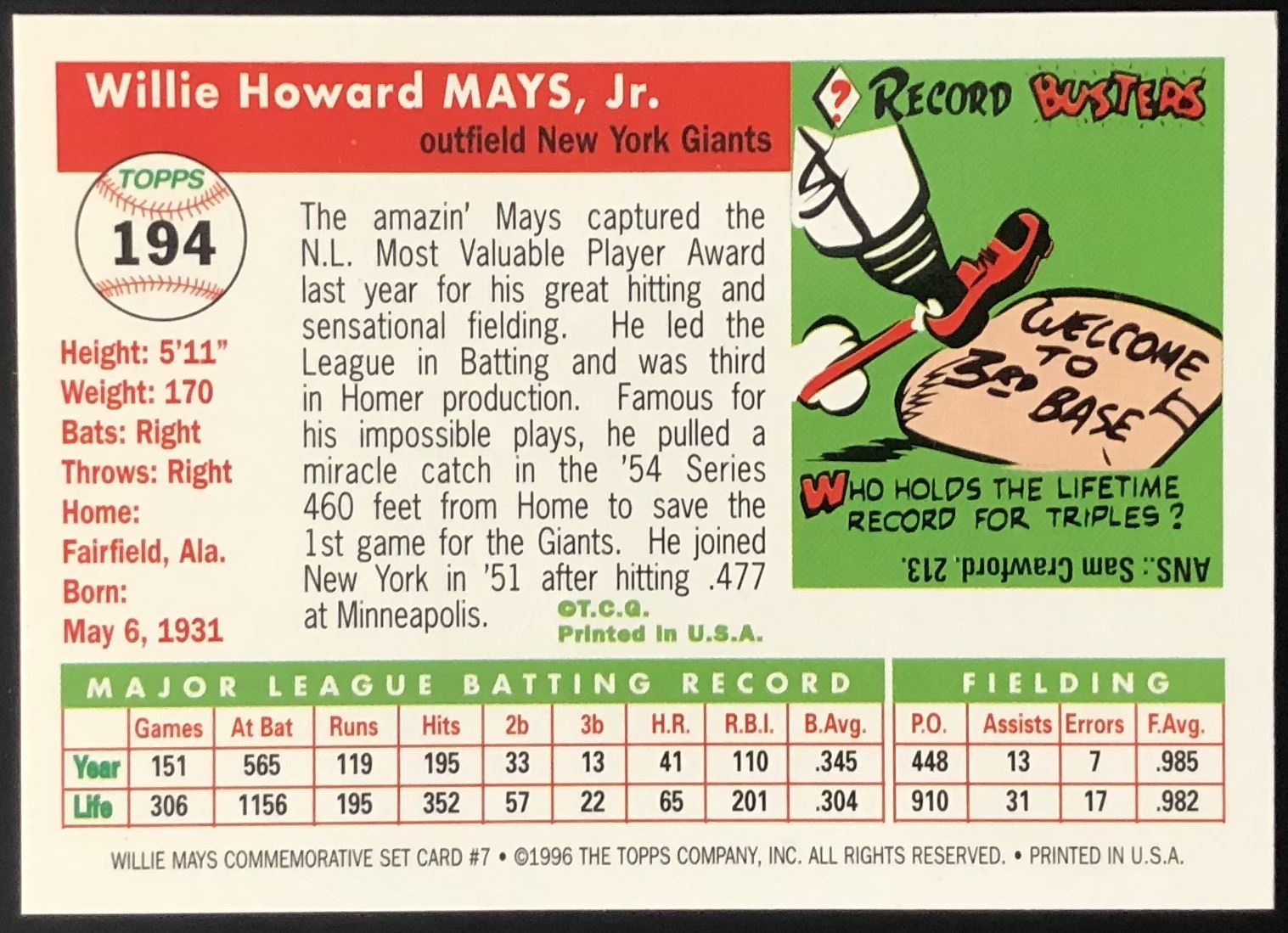 Card #194 MLB, baseball, hall of fame