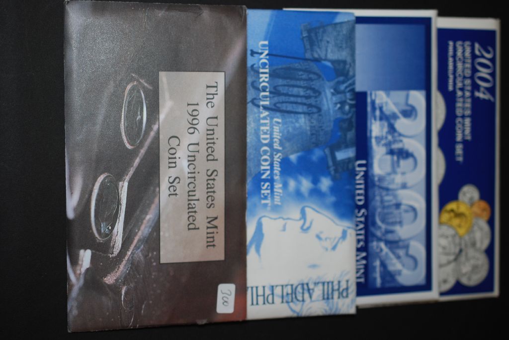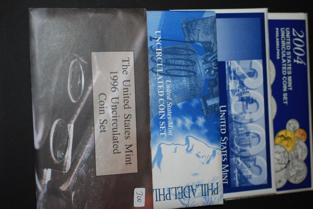 1996 US Mint Coin Set To Include 1996-W US Roosevelt Commemorative 50 Year Anniversary Dime With COA Included; P&D Mints, 1999-P US Mint Coin Set To Include US Mint State Quarter Coin Set, 2002-P US Mint Coin Set To Include US Mint State Quarter Coin Set With COA Included & 2004-P US Mint Coin Set To Include US Mint State Quarter Coin Set; UNC; Lot of 4 Sets; UNC; EST. $25-35