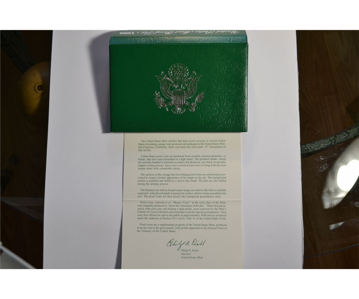 *1996 United States Mint Proof Set with Certificate of Authenticity Excellent Condition* ***Coin, Currency & All Items Listed in this auction - Grades, Conditions and Values are not Safe Deposit Coins LLC Responsibilty. Grades, Condition and Values are determined by Consigner(s) & Buyers ONLY***