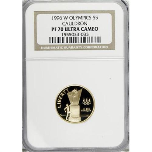 <B>1996-W G$5 Olympic/Cauldron Gold Five Dollar PR70 Deep Cameo NGC.</B></I> NGC Census: (0/0). PCGS Population (13/0). Numismedia Wsl. Price for NGC/PCGS coin in PR70: $1,125. (#9739)<BR><BR><b>Shipping:</b> Coins & Currency (<a target="_blank" href="http://www.heritageauctions.com/common/shipping.php">view shipping information</a>)
